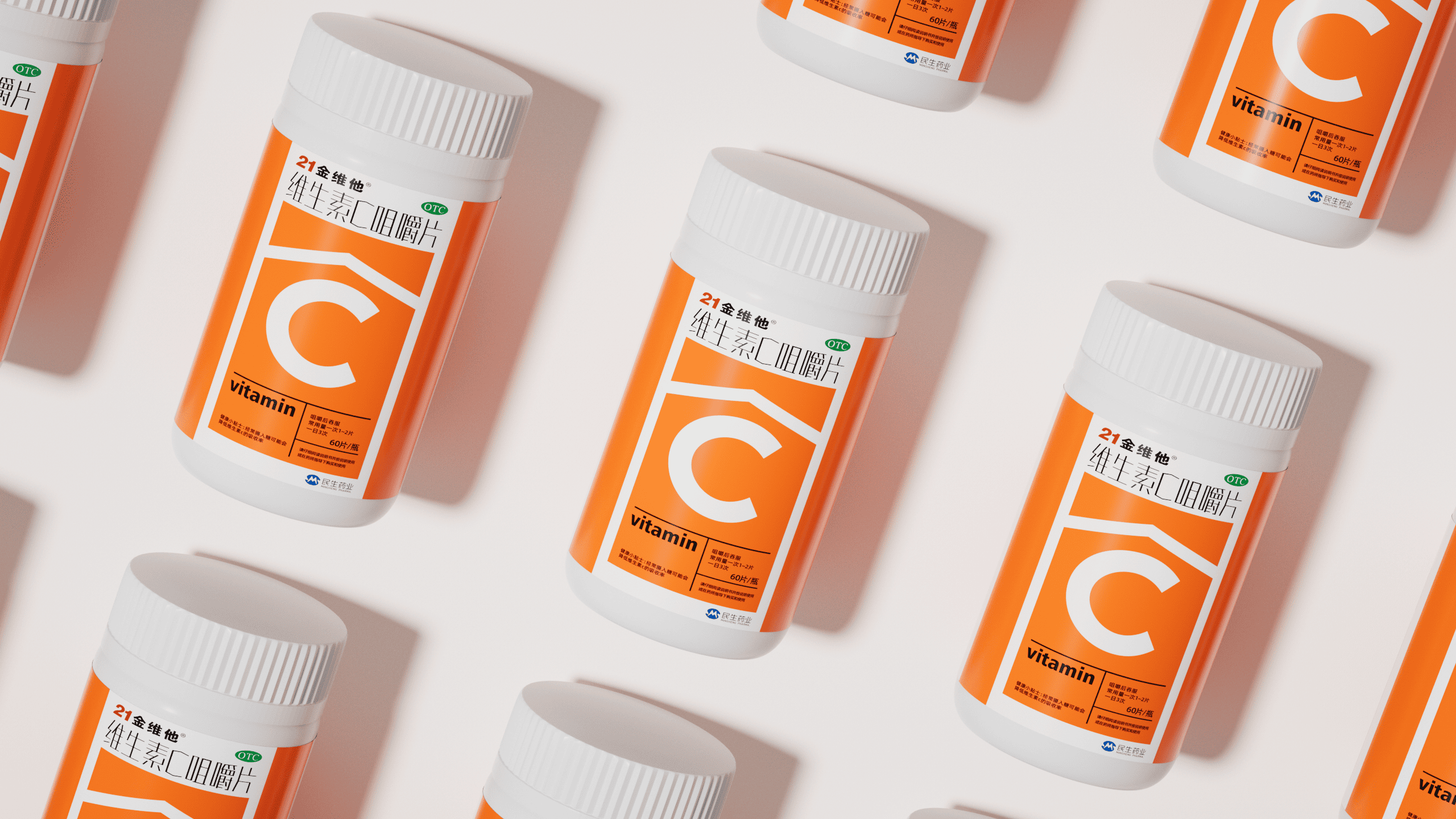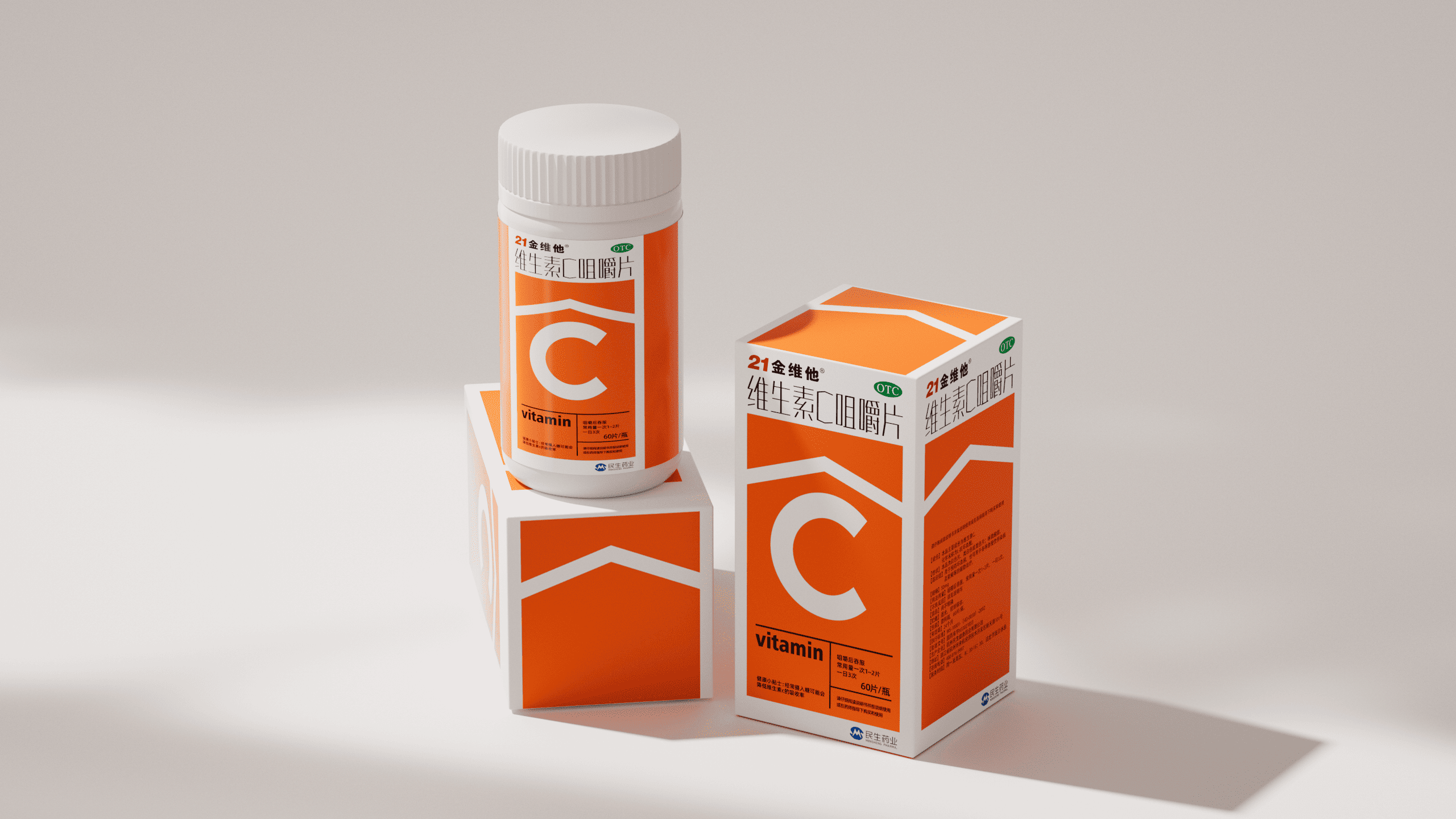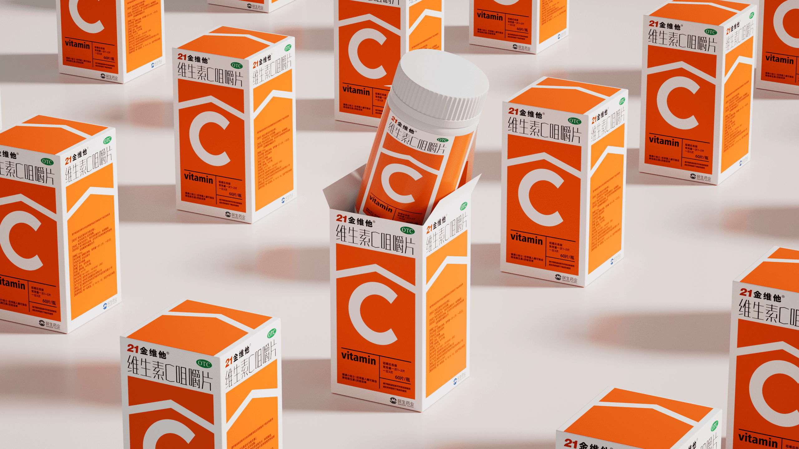 <p>本项目为民生健康旗下 21 金维他维生素 C 咀嚼片的包装升级方案。在设计上,以 “C” 为视觉超级符号,通过撞色直观展现产品高维 C 含量,并强化 “信息层” 高效传递品牌名、OTC 标识、产品名及 “60 片 / 瓶” 规格等核心信息,符合包装规范的同时提升消费者信息获取效率。在质感上,采用哑光白瓶身与高身结构,既保留民生药业的专业药企基因,又通过视觉轻量化传递专业可靠气质,最终实现 “货架吸睛” 与 “品牌信任” 的双重落地,助力产品在多元消费场景与激烈市场竞争中精准触达目标客群。</p>