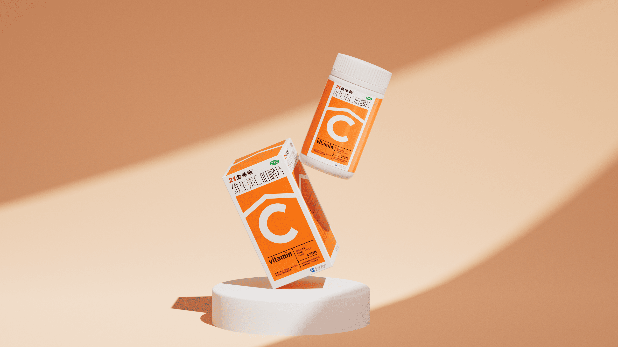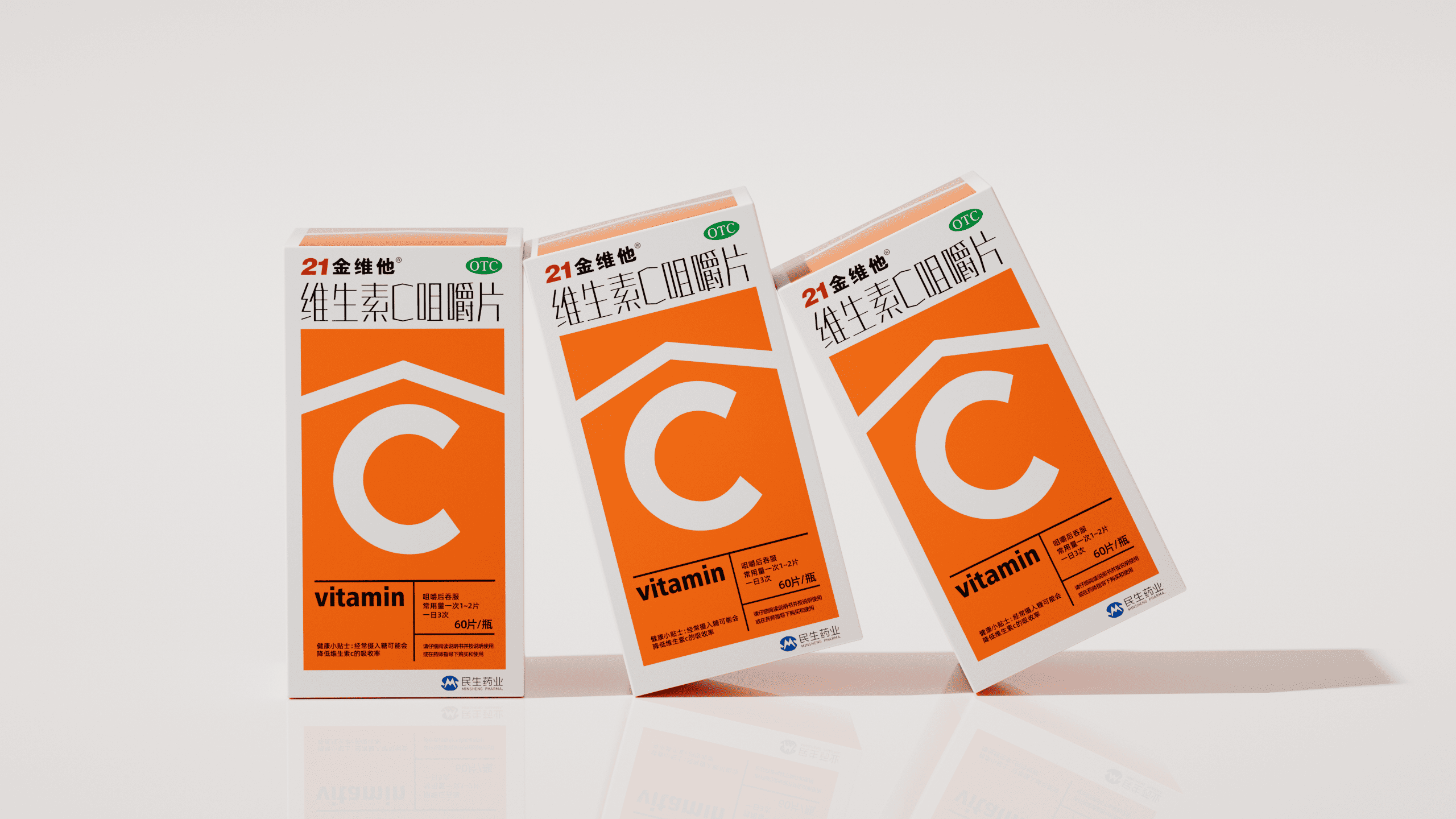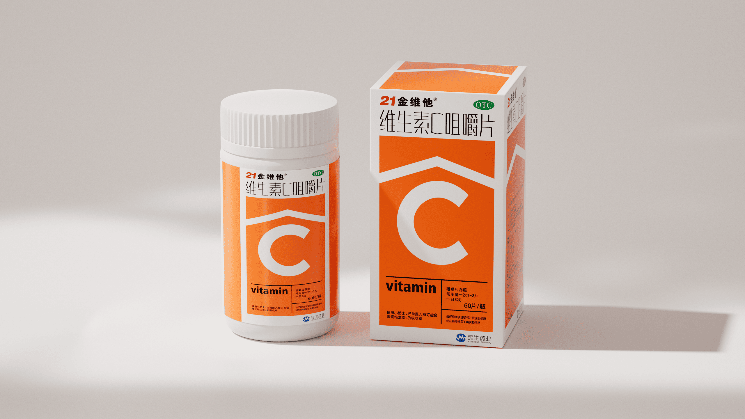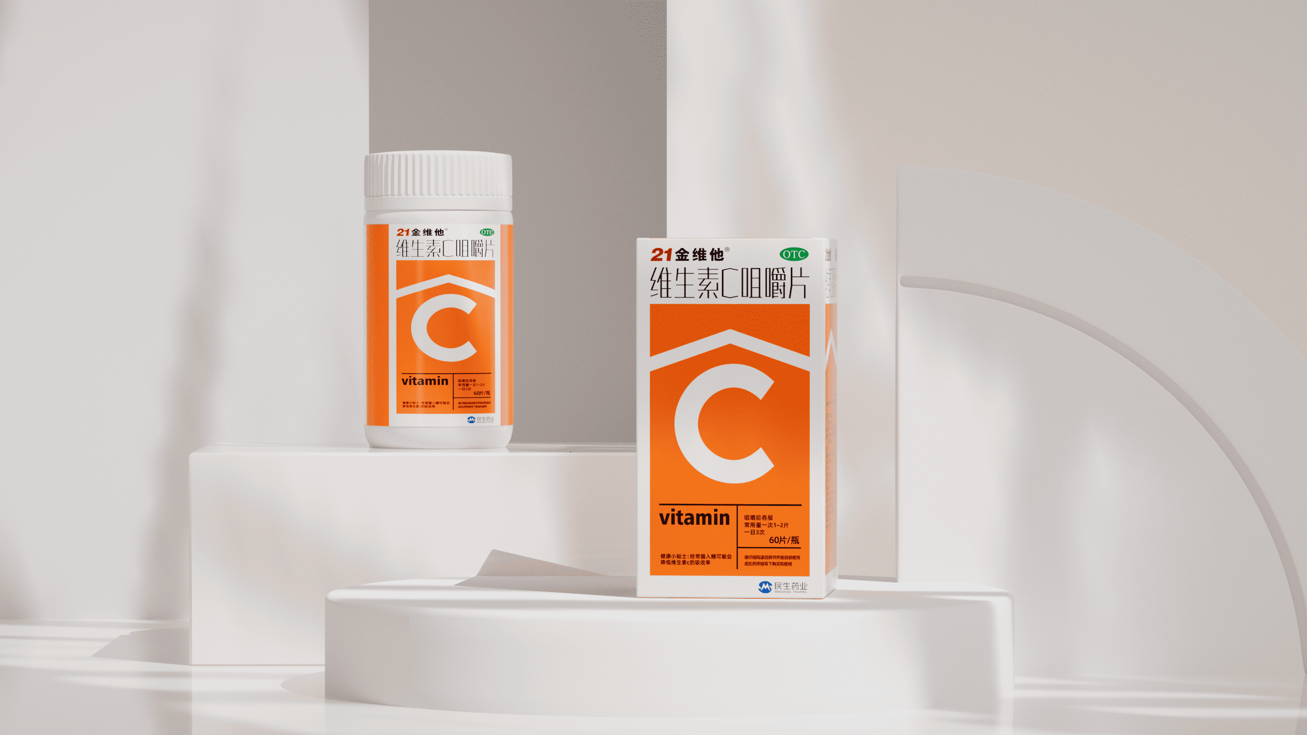 <p>本项目为民生健康旗下 21 金维他维生素 C 咀嚼片的包装升级方案。在设计上,以 “C” 为视觉超级符号,通过撞色直观展现产品高维 C 含量,并强化 “信息层” 高效传递品牌名、OTC 标识、产品名及 “60 片 / 瓶” 规格等核心信息,符合包装规范的同时提升消费者信息获取效率。在质感上,采用哑光白瓶身与高身结构,既保留民生药业的专业药企基因,又通过视觉轻量化传递专业可靠气质,最终实现 “货架吸睛” 与 “品牌信任” 的双重落地,助力产品在多元消费场景与激烈市场竞争中精准触达目标客群。</p>